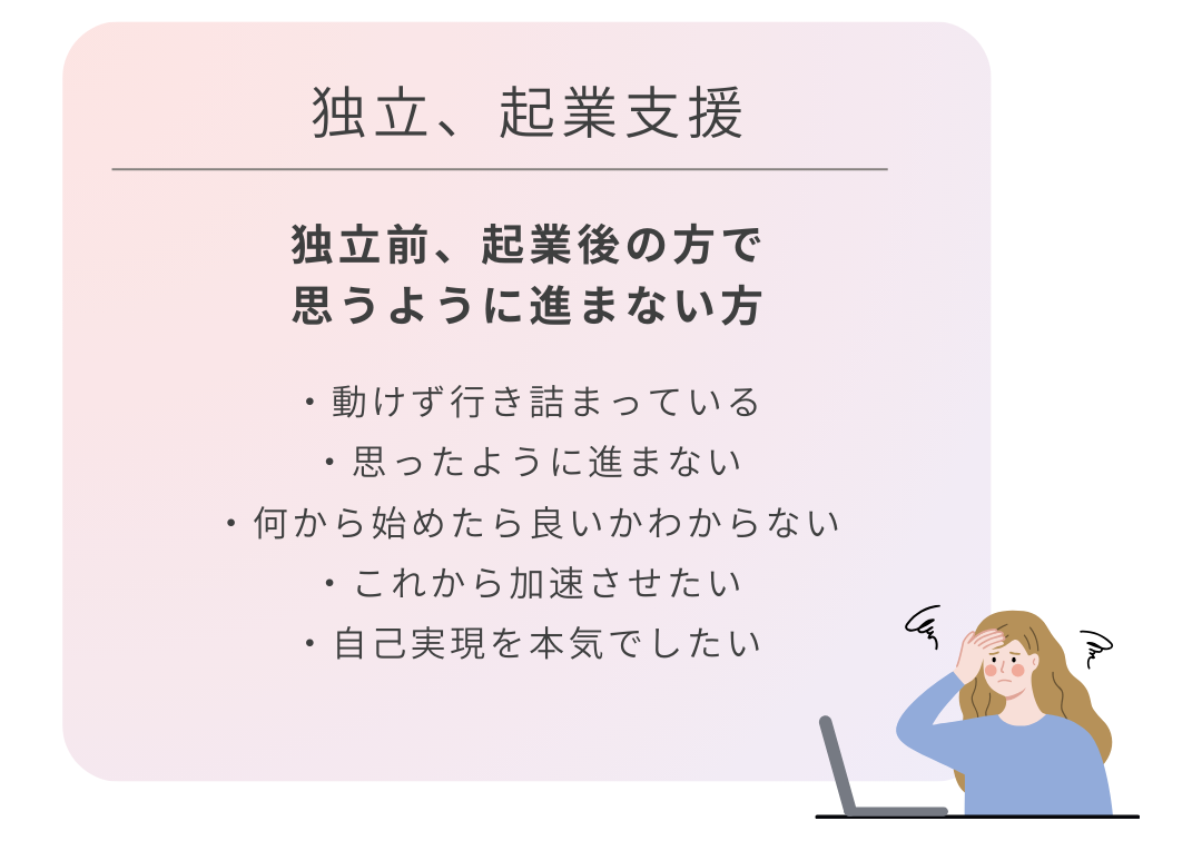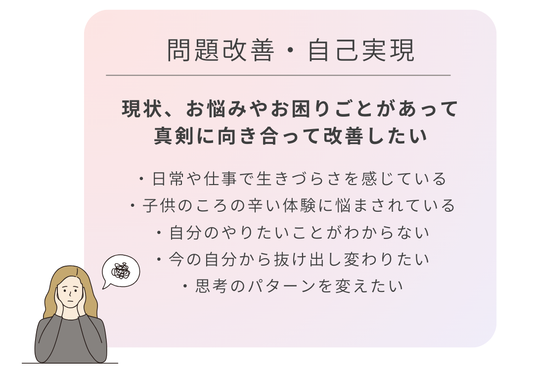 それ以外にも、変わりたいけど何から始めたら良いかわからない・自己実現させたいという方はまずはご相談ください。